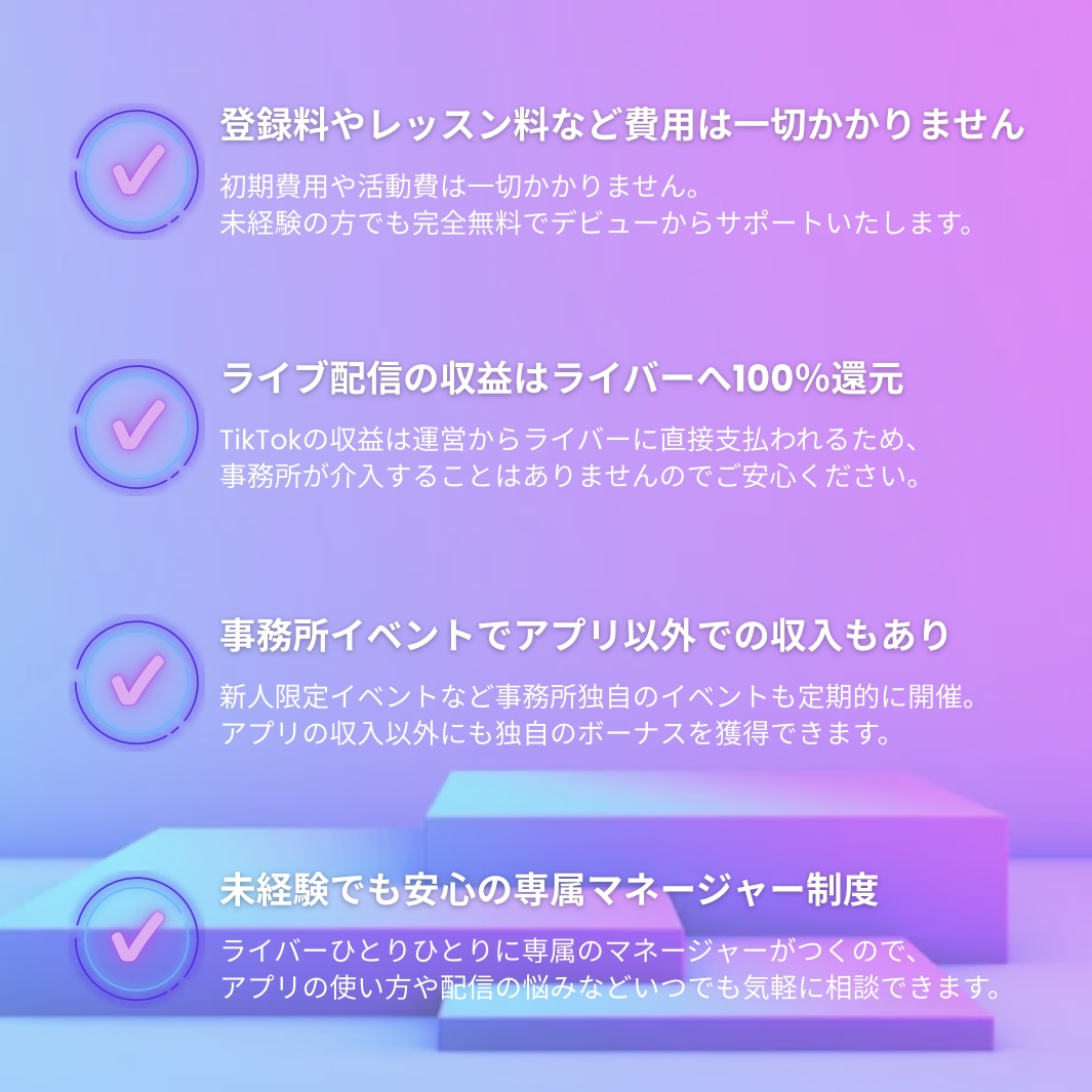 A.大丈夫です。わからないことは全力でサポートいたします。所属ライバーさんの中でも初心者から始めて活躍されている方は多数いらっしゃいます!